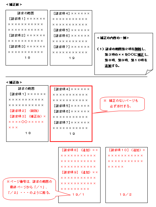 a 「請求の範囲」を補正する場合には、補正後の請求の範囲全文を記載したものを、差替え用紙として提出しなければなりません。