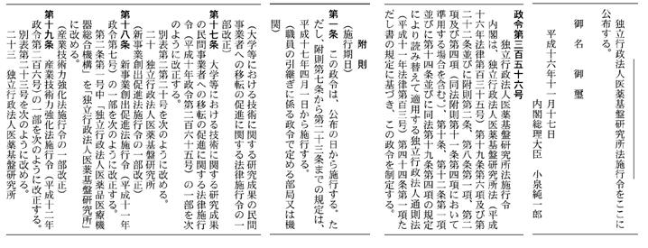 | 平成16年11月17日 | 政令 第356号 | 独立行政法人医薬基盤研究所施行令の公布 | 施行:平成17年4月1日 | 附17条-TLO施 | 官報 |