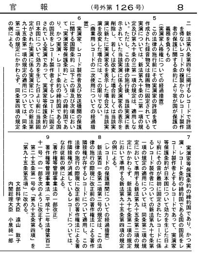 ・平成11年6月23日法律第77号(著作権法の一部を改正する法律) 施行:平成12年1月1日 官報1、 官報2、 官報3、 官報4 ・平成十一年十二月二十二日法律第百六十号(中央省庁等改革関係法施行令)第五百六十三条 施行:平成十三年一月六日 官報 ・平成十一年十二月二十二日法律第二百二十号(独立行政法人の業務実施の円滑化のための関係法律の整備等に関する法律)第十五条 施行:平成十三年一月六日 官報1 ・平成12年5月8日法律第56号(著作権法及び万国著作権条約の実施に伴う著作権法の特例に関する法律の一部を改正する法律)第1条 施行:平成13年1月1日。但し、第58条については、著作権に関する世界知的所有権機関条約が日本国について効力を発効する日(2002年3月6日)。 (注)第58条:日本加盟平成12年5月8日、21カ国目。30カ国加盟により発効。(H13.02.09時点) 官報 ・平成12年11月29日法律第131号(著作権等管理事業法)附則第8条、第9条 施行:平成13年10月1日 官報 ・平成13年12月5日法律第140号(独立行政法人等の保有する情報の公開に関する法律)附則第6条 施行:平成14年10月1日 官報 ・平成14年6月19日法律第72号(著作権法の一部を改正する法律) 施行:一部:「実演・レコード条約」発効の日(2002年10月9日)、一部:平成15年1月1日 改正概要 官報1、 官報2、 官報3 ・平成15年5月30日法律第61号(行政機関の保有する個人情報の保護に関する法律等の施行に伴う関係法律の整備等に関する法律)第18条 施行:平成17年4月1日 官報 ・平成15年6月18日法律第85号(著作権法の一部を改正する法律) 施行:平成16年1月1日 官報 ・平成15年7月16日法律第119号(地方独立行政法人法の施行に伴う関係法律の整備等に関する法律)第35条 施行:平成16年4月1日 官報 ・平成16年6月9日法律第84号(行政事件訴訟法の一部を改正する法律)附則第8条 施行:平成17年4月1日官報 ・平成16年6月9日法律第92号(著作権法の一部改正) 施行:平成17年1月1日 官報1、官報2 ・平成16年6月18日法律第120号(裁判所法の一部改正)第9条 施行:平成17年4月1日 官報1、 官報4、 官報5、 官報6 ・平成16年12月1日法律第147号(民法の一部改正)附則第75条 施行:平成17年4月1日 官報 ・平成17年6月29日法律第75号(不正競争防止法の一部改正)第6条 施行:平成17年11月1日 官報1、官報2、官報3、官報4 ・平成18年6月2日法律第50号(一般社団法人及び一般財団法人に関する法律及び公益社団法人及び公益財団法人の認定等に関する法律の施行に伴う関係法律の整備等に関する法律)第271条 施行:平成20年12月1日(H19政275) 官報1、官報4、官報10 ・平成18年12月22日法律第121号(著作権法の一部改正) 施行:平成19年1月11日、平成19年7月1日 対照表 改正の概要 官報1、官報2、官報3 ・平成20年6月18日法律第81号(障害のある児童及び生徒のための教科用特定図書等の普及の促進等に関する法律)附則第4条 施行:平成20年9月17日 官報1、官報2 ・平成21年6月19日法律第53号(著作権法の一部を改正する法律案) 施行:平成21年1月1日、平成23年6月1日 官報1、官報2、官報3、官報4 ・平成21年7月10日法律第73号(国立国会図書館法の一部を改正する法律) 施行:平成22年4月1日 官報 ・平成22年12月3日法律第65号(放送法等の一部を改正する法律)附則第30条 施行:平成23年6月30日 官報1、官報2、官報3 ・平成24年6月22日法律第32号(国立国会図書館法の一部を改正する法律) 施行日:平成25年7月1日 附則第4条 官報1、官報2 ・平成24年6月27日法律第43号(著作権法の一部を改正する法律) 施行:平成24年10月1日、平成25年1月1日 官報1、官報2、官報3、官報4 ・平成25年11月27日法律第84号(薬事法等の一部を改正する法律) 施行:平成26年11月25日 官報1、官報2、官報3 ・平成26年5月14日法律第35号(著作権法の一部を改正する法律) 施行:平成27年1月1日、北京条約効力日 官報1、官報2 |