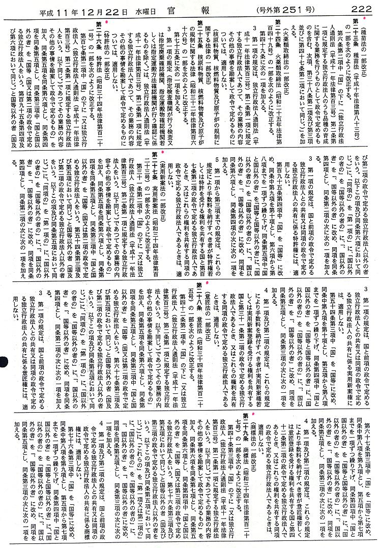 ・平成11年5月14法律第41号(特許法等の一部を改正する法律)第1条 施行:平成12年1月1日、但し特許法第48条の3等(出願審査の請求期間の短縮)は、平成13年10月1日、商標法第68条の2(第68条の40に変更)等(標章の国際登録に関するマドリッド協定の議定書の実施)は、議定書の発行の日(平成12年3月14日)、特例法第4条等(電子情報処理組織を使用した処分等の見直し)のうち、「電子情報処理組織を使用して行う国際登録に係る商標原簿の閲覧に関する規定」は、平成13年1月1日。