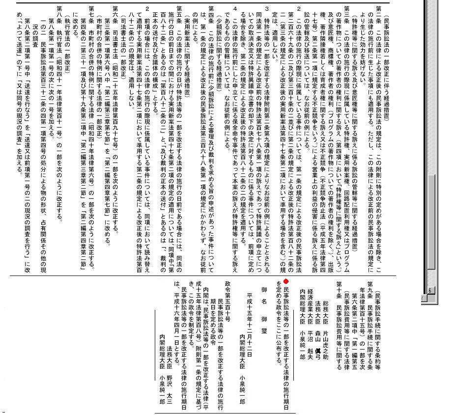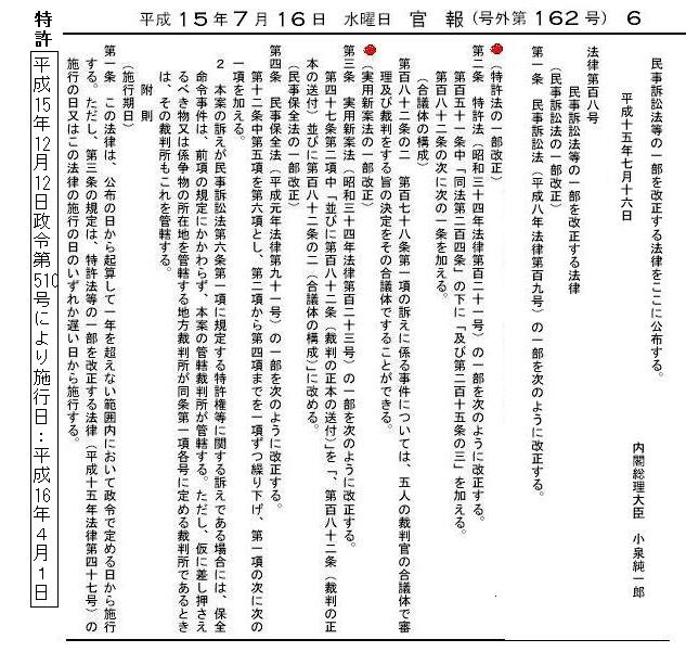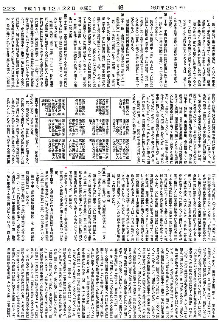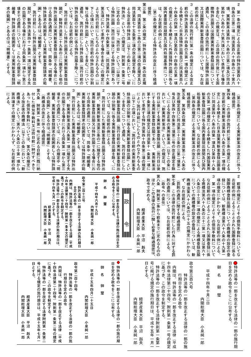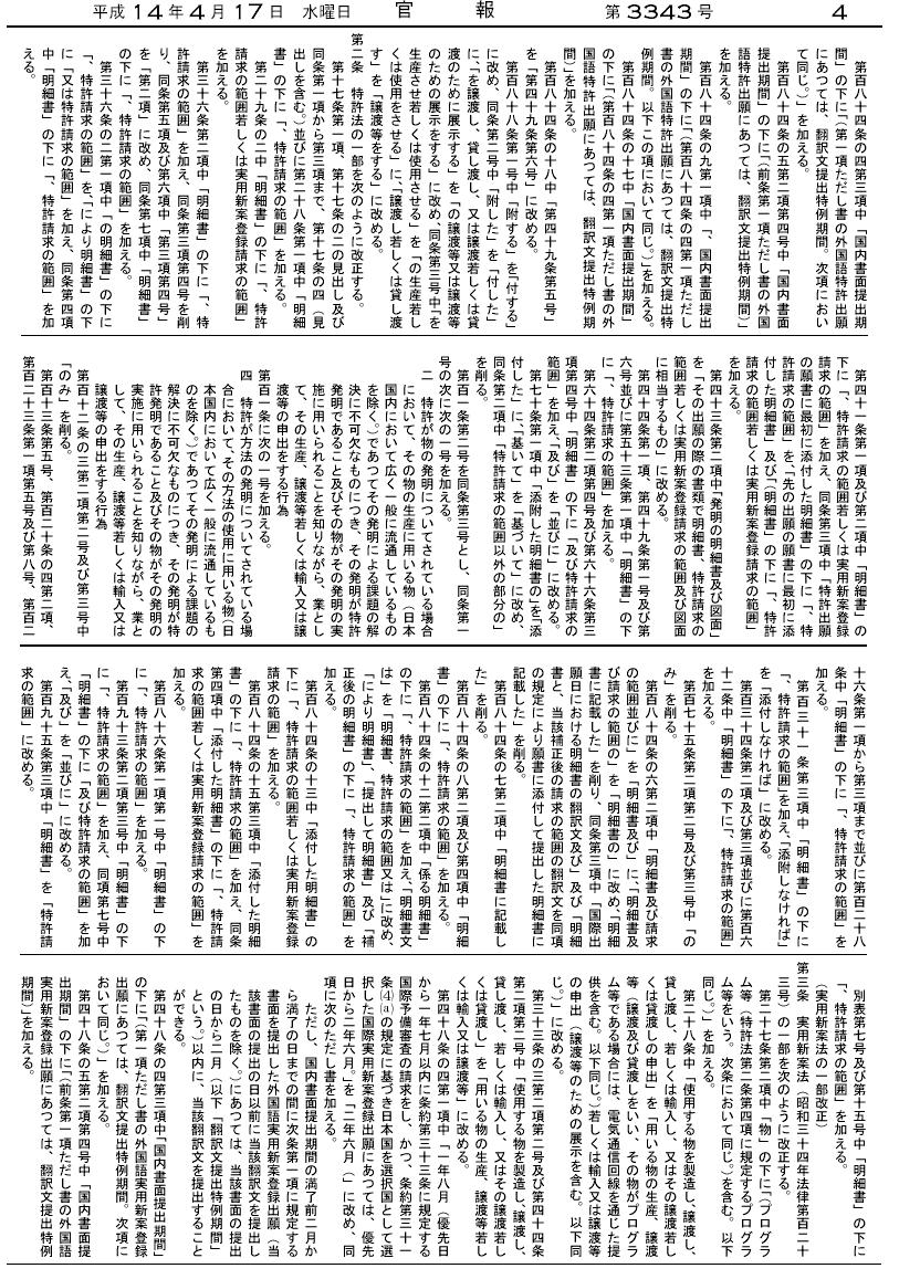 施行日詳細は、こちら。 改正対照表、 官報1、 官報2、 官報3、 官報4、 官報5、 官報6、 官報7、 官報8、 官報9、 官報10 ・平成11年5月14日法律第43号(行政機関の保有する情報の公開に関する法律の施行に伴う関係法律の整備等に関する法律)第15条 施行:政令で定める日(平成13年4月1日) 官報1、 官報2、 官報3 ・平成11年12月8日法律第151号(民法の一部を改正する法律の施行に伴う関係法律の整備等に関する法律第85条(特許法の一部を次のように改正する) 施行:平成12年4月1日 官報 ・平成十一年十二月二十二日法律第百六十号(中央省庁等改革関係法施行令)第九百十一条 施行:平成十三年一月六日 官報 ・平成十一年十二月二十二日法律第二百二十号(独立行政法人の業務実施の円滑化のための関係法律の整備等に関する法律)第二十六条 施行:平成十三年一月六日 官報1、 官報2、 官報3、 官報4 ・平成13年7月4日法律第96号(民事訴訟法の一部を改正する法律)附則2 施行日:平成13年12月1日(H13.9.19政303) 官報 ・平成14年4月17日法律第24号(特許法等の一部を改正する法律)第1条、第2条 施行:別途定める。 施行日:附則第1条関係平成14年9月1日 附則第1条第1号関係:平成15年1月1日 附則第1条第2号 平成15年7月1日施行日概要 官報1、 官報2、 官報3、 官報4 改正概要 改正対照表 説明会 ・平成14年7月31日法律第100号(民間事業者による信書の送達に関する法律の施行に伴う関係法律の整備等に関する法律)第45条 施行:平成15年4月1日 官報 ・平成15年5月23日法律第47号(特許法等の一部を改正する法律) 施行:平成16年1月1日・平成16年4月1日 改正内容 改正条文一覧 ・平成15年5月30日法律第61号(行政機関の保有する個人情報の保護に関する法律等の施行に伴う関係法律の整備等に関する法律)第26条 施行:平成17年4月1日 官報 ・平成15年7月16日法律第108号(民事訴訟法の一部を改正する法律)第2条 施行:平成16年4月1日 官報1、 官報2 ・平成16年6月2日法律第76号(破産法の施行に伴う関係法令の整備等に関する法律)第70条 施行:平成17年1月1日(H16政317) 官報1、 官報2 ・平成16年6月4日法律第79号(特許審査の迅速化等のための特許法等の一部改正)第1条 施行:交付の日(平成16年6月4日)、平成17年4月1日 改正内容 官報1、 官報2、 官報6 ・平成16年6月9日法律第84号(行政事件訴訟法の一部を改正する法律)附則第8条 施行:平成17年4月1日 官報 ・平成16年6月18日法律第112号(武力攻撃事態等における国民の保護のための措置に関する法律)附則第9条 施行:平成16年9月17日 官報 ・平成16年6月18日法律第120号(裁判所法の一部改正)第4条 施行:平成17年4月1日 官報1、 官報2、 官報5、 官報6 ・平成16年12月1日法律第147号(民法の一部改正)附則第65条 施行:平成17年4月1日 官報 ・平成17年6月29日法律第75号(不正競争防止法の一部改正)第2条 施行:平成17年11月1日 官報1、官報2、官報3、官報4 ・平成17年10月21日法律第102号(郵政民営化法等の施行に伴う関係法律の整備等に関する法律)第69条 施行:平成19年10月1日 官報1、官報2、官報3、官報5 ・平成18年6月7日法律第55号(意匠法等の一部を改正する法律)第2条 施行:平成19年1月1日、平成19年4月1日 官報1、官報2、官報3、官報4 施行日1 施行日2 施行日官報1、施行日官報2 改正内容 ・平成18年12月15日法律第109号(信託法の施行に伴う関係法律の整備等に関する法律)第34条 施行:信託法施行の日 平成19年9月30日 官報1、官報2、官報3 ・平成20年4月18日法律第16号(特許法等の一部を改正する法律)第1条 施行:平成20年6月1日、平成20年9月30日、平成21年1月1日、平成21年4月1日(H20政181、H20政403) 改正内容 官報1、官報2、官報3、官報4 ・平成23年6月8日法律第63号(特許法等の一部を改正する法律) 第1条 施行:平成24年4月1日 改正内容 官報1、 官報2、 官報3、 官報4、 官報5、 官報9、 官報a、 官報c、 官報d、 官報e、 官報f、 官報g ・平成24年5月8日法律第30号(郵政民営化法等の一部を改正する等の法律) 附則第31条 施行:平成24年10月1日 官報1、官報2、官報3 ・平成26年5月14日法律第36号(特許法等の一部を改正する法律) 施行:平成27年4月1日 官報1、官報2、官報3、官報4、官報5、 官報11、官報12 概要: 1 救済措置の拡充等 (一) 手続期間の延長に係る規定の整備 特許法等に基づく手続をする者の責めに帰することができない事由が生じたときは、その手続期間を一定の期間に限り延長することができることとした。(特許法第108条等関係) (二) 優先権主張に係る規定の整備 (1) 優先権主張を伴う特許出願について、その優先期間内に当該特許出願をすることができなかったことに正当な理由があるときは、一定の期間内に限り当該優先権の主張をすることができることとした。(特許法第41条第一項等関係) (2) 優先権の主張をする旨の書面について、 出願と同時でなくとも一定期間内であれば提出できるものとし、その補正についても一定期間内に限りできることとした。(特許法第17条、第17条の4、第41条第四項等関係) (三) 特許出願審査の請求期間の徒過に係る救済規定の整備 特許出願審査の請求について、その請求期間の徒過に正