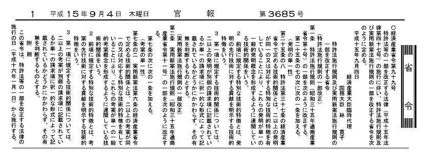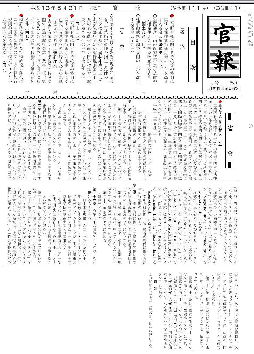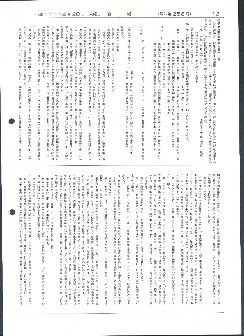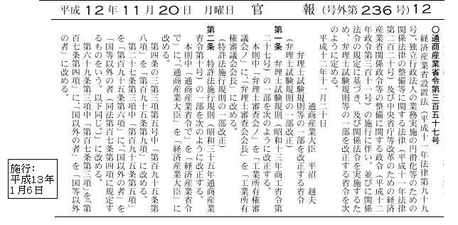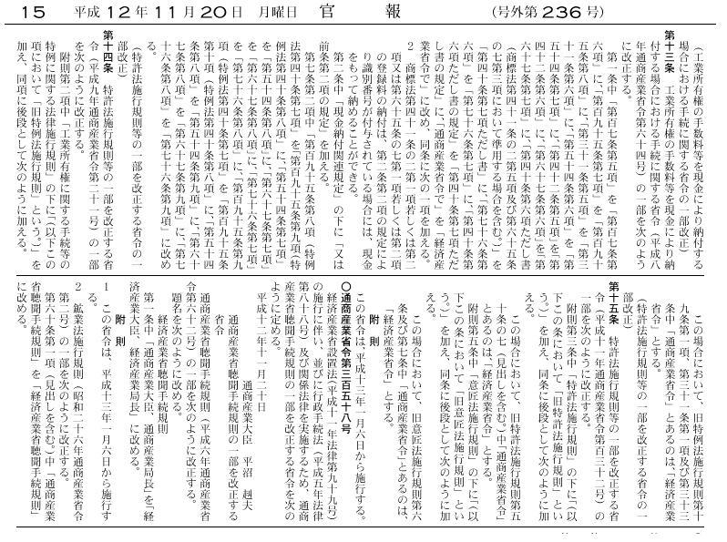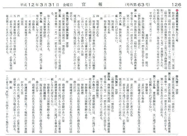 ・平成11年9月30日共省令第1号(産業活力再生特別措置法施行規則) (注):総理府、厚生省、農林水産庁、通商産業省、運輸省、郵政省、建設省・共省令附則第2条 施行:平成11年10月1日 官報 ・平成11年12月28日省令第132号(特許法施行規則等の一部を改正する省令)第1条 施行:平成12年1月1日 改正内容 官報1他、【全改正条令】参照。 ・平成12年3月31日省令第92号(特許法施行規則等の一部を改正する省令)第1条 施行:平成12年4月1日改正内容 官報 ・平成12年4月19日省令第99号(産業技術力強化法施行規則:新設)附則2条 施行:平成12年4月20日官報 ・平成12年11月20日省令第357号(弁理士試験規則規則等の一部を改正する省令) 第2条 施行:平成13年1月6日 官報1、 官報2、 官報3、 官報4 ・平成13年2月13日省令第7号(工業所有権の手続等の特例に関する法律施行規則等の一部を改正する省令) 施行:交付の日:平成13年2月13日官報 ・平成13年5月31日省令第166号(工業所有権に関する手続等の特例に関する法律施行規則等の一部を改正する省令)第1条 施行:平成13年6月1日官報 ・平成13年9月6日省令第190号(特許法施行規則の一部を改正する省令) 施行:平成13年10月1日官報 ・平成13年11月20日省令第207号(特許法施行規則の一部を改正する省令) 施行:平成13年12月1日官報 ・平成14年8月1日省令第94号(特許法施行規則等の一部を改正する政令)第1条 施行:平成14年9月1日改正概要、官報 ・平成15年6月6日省令第72号(特許法施行規則等の一部を改正する省令)第1条 施行:平成15年7月1日 改正内容 官報1、 官報2、 官報3、 官報4、 官報5、 官報6、 官報7 ・平成15年9月4日省令第99号(特許法施行規則及び実用新案法施行規則の一部を改正する省令)第1条 施行:平成16年1月1日官報 ・平成15年9月10日省令第101号(工業所有権に関する手続等の特例に関する法律施行規則等の一部を改正する省令)第2条 施行:平成15年10月1日 改正内容 官報9 ・平成15年10月27日省令第141号(特許法施行規則等の一部を改正する省令)第1条 施行:平成16年1月1日 概要 官報1、官報2、官報3、官報4 ・平成16年3月2日省令第28号(特許法施行規則等の一部を改正する省令)第1条 施行:平成16年4月1日 改正内容 官報1、官報2、官報3、官報4、官報5 ・平成16年6月4日省令第69号(特許法施行規則等の一部を改正する省令)第1条 施行:平成16年6月4日 改正内容(改正:様式のみ) 官報1、 官報2、 官報3 ・平成17年3月4日省令第14号(不動産登記法等の施行に伴う経済産業省関係省令の整理等に関する省令の一部を改正する省令)第7条(様式) 施行:平成17年3月7日 官報 ・平成17年3月29日省令第30号(特許審査の迅速化等のための特許法等の一部を改正する法律の施行に伴う関係省令の整備等に関する省令)第1条 施行:平成17年4月1日 改正内容 官報1、 官報2 ・平成17年10月3日省令96号(工業所有権に関する手続等の特例に関する法律施行規則等の一部を改正する省令)第2条(様式のみ) 施行:平成17年10月3日 官報1、官報2、官報3、官報4 ・平成17年12月12日省令第118号(特許法施行規則等の一部を改正する省令)第1条(様式のみ) 施行:平成17年12月12日 概要、新旧対照表、官報1、官報2 ・平成18年6月8日省令第77号(中小企業のものづくり基盤技術の高度化に関する法律施行規則)附則第2条(様式あり) 施行:平成18年6月13日 官報1、官報2 ・平成18年8月9日省令第81号(特許法施行規則の一部を改正する省令) 施行:平成18年8月9日 官報 対照表 ・平成19年3月26日省令第14号(意匠法等の一部を改正する法律の施行に伴う関係省令の整備及び経過措置等に関する省令)第1条 施行:平成19年4月1日、平成19年7月1日 官報1、官報2、官報5 改正内容 ・平成19年3月30日省令第26号(特許協力条約に基づく国際出願等に関する法律施行規則等の一部を改正する省令)第2条 施行:平成19年4月1日 官報1、官報10、官報11 改正内容 ・平成19年8月3日省令第50号(産業活力再生特別措置法等の一部を改正する法律の施行に伴う経済産業省関係省令の整備に関する省令)第3条 施行:平成19年8月6日 官報1、官報2、官報3 ・平成19年9月28日省令第64号(郵政民営化法等の施行に伴う)特許法施行規則及び特許協力条約に基づく国際出願等に関する法律施行規則の一部を改正する省令 第1条 施行:平成19年10月1日 官報 ・平成19年9月28日省令第68号(信託法及び信託法の施行に伴う関係法律の整備等に関する法律の施行に伴う経済産業省関係省令の整備等に関する省令)第2条 施行:平成19年9月30日 官報1、官報2、官報3、官報4 ・平成20年3月24日省令第19号(特許法施行規則の一部を改正する省令) 施行:平成20年4月1日 官報 ・平成20年9月30日省令第69号(特許法等の一部改正に伴う関係省令の整備に関する省令)第1条(様式のみ) 施行:平成20年10月1日 官報1、官報2 ・平成20年12月26日省令第90号(特許法施行規則等の一部を改正する省令)第1条(様式のみ) 施行:平成21年1月1日 改正内容 官報1、 官報2、 官報3、 官報4 ・平成21年1月30日省令第5号(特許法施行規則等の一部を改正する省令) 施行:平成21年4月1日 第1条(様式あり) 改正内容 官報1、 官報2、 官報8 ・平成21年6月22日省令第34号(我が国にお