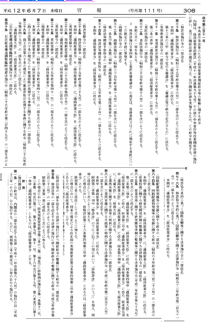 ・平成11年12月27日政令第430号(特許法施行令等の一部を改正する政令)第6条 施行:平成12年1月1日 改正内容