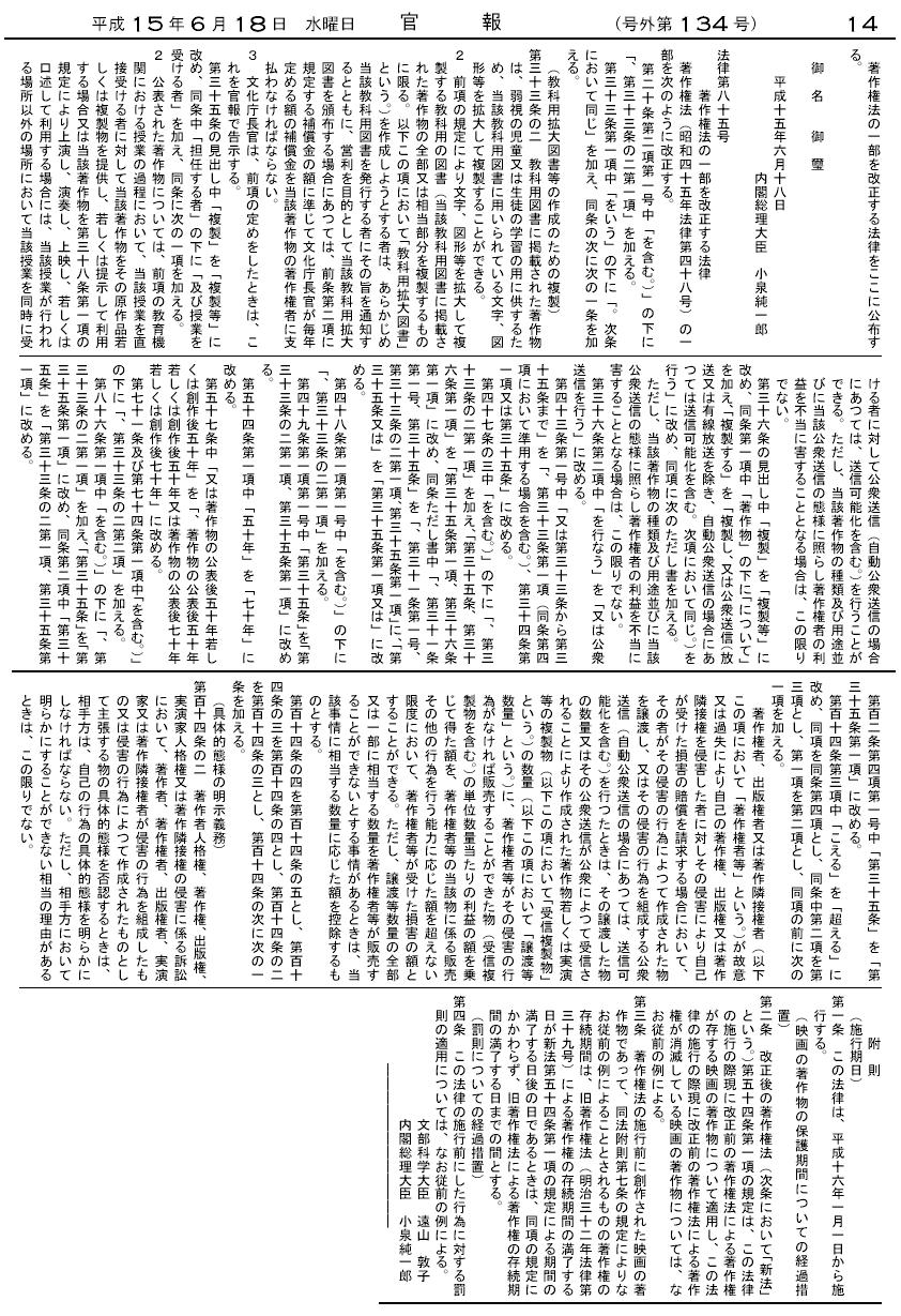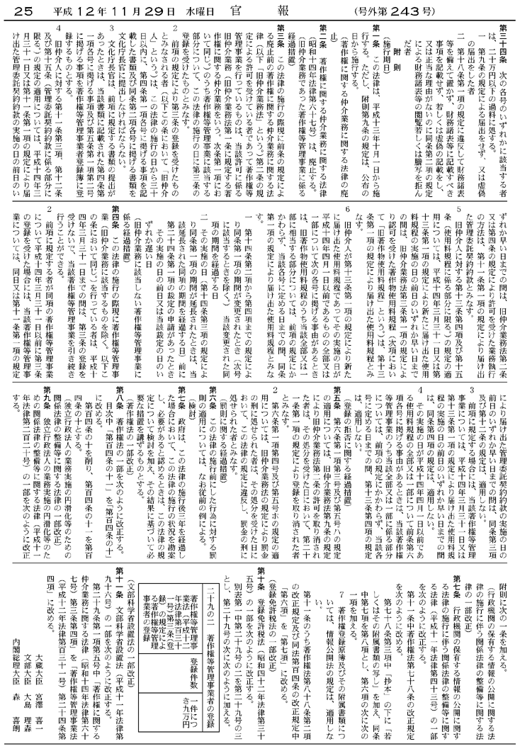 ・平成11年6月23日法律第77号(著作権法の一部を改正する法律) 施行:平成12年1月1日 官報1、 官報2、 官報3、 官報4 ・平成十一年十二月二十二日法律第百六十号(中央省庁等改革関係法施行令)第五百六十三条 施行:平成十三年一月六日 官報 ・平成十一年十二月二十二日法律第二百二十号(独立行政法人の業務実施の円滑化のための関係法律の整備等に関する法律)第十五条 施行:平成十三年一月六日 官報1 ・平成12年5月8日法律第56号(著作権法及び万国著作権条約の実施に伴う著作権法の特例に関する法律の一部を改正する法律)第1条 施行:平成13年1月1日。但し、第58条については、著作権に関する世界知的所有権機関条約が日本国について効力を発効する日(2002年3月6日)。 (注)第58条:日本加盟平成12年5月8日、21カ国目。30カ国加盟により発効。(H13.02.09時点) 官報 ・平成12年11月29日法律第131号(著作権等管理事業法)附則第8条、第9条 施行:平成13年10月1日 官報 ・平成13年12月5日法律第140号(独立行政法人等の保有する情報の公開に関する法律)附則第6条 施行:平成14年10月1日 官報 ・平成14年6月19日法律第72号(著作権法の一部を改正する法律) 施行:一部:「実演・レコード条約」発効の日(2002年10月9日)、一部:平成15年1月1日 改正概要 官報1、 官報2、 官報3 ・平成15年5月30日法律第61号(行政機関の保有する個人情報の保護に関する法律等の施行に伴う関係法律の整備等に関する法律)第18条 施行:平成17年4月1日 官報 ・平成15年6月18日法律第85号(著作権法の一部を改正する法律) 施行:平成16年1月1日 官報 ・平成15年7月16日法律第119号(地方独立行政法人法の施行に伴う関係法律の整備等に関する法律)第35条 施行:平成16年4月1日 官報 ・平成16年6月9日法律第84号(行政事件訴訟法の一部を改正する法律)附則第8条 施行:平成17年4月1日官報 ・平成16年6月9日法律第92号(著作権法の一部改正) 施行:平成17年1月1日 官報1、官報2 ・平成16年6月18日法律第120号(裁判所法の一部改正)第9条 施行:平成17年4月1日 官報1、 官報4、 官報5、 官報6 ・平成16年12月1日法律第147号(民法の一部改正)附則第75条 施行:平成17年4月1日 官報 ・平成17年6月29日法律第75号(不正競争防止法の一部改正)第6条 施行:平成17年11月1日 官報1、官報2、官報3、官報4 ・平成18年6月2日法律第50号(一般社団法人及び一般財団法人に関する法律及び公益社団法人及び公益財団法人の認定等に関する法律の施行に伴う関係法律の整備等に関する法律)第271条 施行:平成20年12月1日(H19政275) 官報1、官報4、官報10 ・平成18年12月22日法律第121号(著作権法の一部改正) 施行:平成19年1月11日、平成19年7月1日 対照表 改正の概要 官報1、官報2、官報3 ・平成20年6月18日法律第81号(障害のある児童及び生徒のための教科用特定図書等の普及の促進等に関する法律)附則第4条 施行:平成20年9月17日 官報1、官報2 ・平成21年6月19日法律第53号(著作権法の一部を改正する法律案) 施行:平成21年1月1日、平成23年6月1日 官報1、官報2、官報3、官報4 ・平成21年7月10日法律第73号(国立国会図書館法の一部を改正する法律) 施行:平成22年4月1日 官報 ・平成22年12月3日法律第65号(放送法等の一部を改正する法律)附則第30条 施行:平成23年6月30日 官報1、官報2、官報3 ・平成24年6月22日法律第32号(国立国会図書館法の一部を改正する法律) 施行日:平成25年7月1日 附則第4条 官報1、官報2 ・平成24年6月27日法律第43号(著作権法の一部を改正する法律) 施行:平成24年10月1日、平成25年1月1日 官報1、官報2、官報3、官報4 ・平成25年11月27日法律第84号(薬事法等の一部を改正する法律) 施行:平成26年11月25日 官報1、官報2、官報3 ・平成26年5月14日法律第35号(著作権法の一部を改正する法律) 施行:平成27年1月1日、北京条約効力日 官報1、官報2 ・平成26年6月13日法律第69号(行政不服審査法の施行に伴う関係法律の整備等に関する法律) 第112条 施行:平成28年4月1日 官報1、官報2、官報8 概要: 1 行政不服審査法(平成26年法律第68号)の施行に伴い、関係法律について、審査請求及び異議申立てを審査請求に一元化すること等に伴う規定の整備を行うとともに、不服申立てに対する裁決を経た後でなければ訴えを提起することができないこととする規定について、一定の場合を除き廃止することとした。(第一条〜第三四二条関係) 2 この法律は、行政不服審査法の施行の日から施行することとした。 ・平成28年5月27日法律第51号(行政機関等の保有する個人情報の適正かつ効果的な活用による新たな産業の創出並びに活力ある経済社会及び豊かな国民生活の実現に資するための関係法律の整備に関する法律) 附則第5条 施行:平成29年5月30日 官報1、官報2、官報3 概要: 行政機関の保有する情報の公開に関する法律(H11法42)第二条(定義)の改正に伴う改正 |