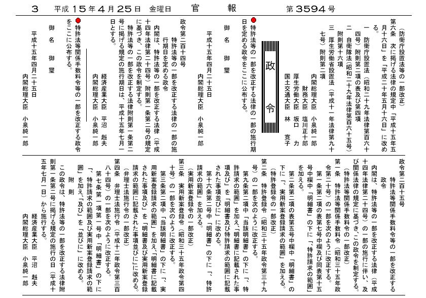 ・平成12年11月20日省令第357号(弁理士試験規則規則等の一部を改正する省令)第13条(現金納付令改正) 施行:平成13年1月6日 官報 ・平成14年8月1日政令第271号(法人税法施行令等の一部改正)附則第18条 施行:平成14年8月1日 ・平成15年4月25日政令第215号(特許法等関係手数料令等の一部改正)第1条(特許法関係手数料令) 施行:平成15年7月1日 概要 官報 ・平成15年6月6日省令第72号(特許法施行規則等の一部を改正する省令)第7条 施行:平成15年7月1日 改正内容 官報d ・平成15年9月10日政令第398号(特許法等の一部を改正する法律の一部の施行に伴う関係政令の整備に関する政令)第5条−手数料令 施行:平成16年4月1日 改正内容 ・平成15年9月10日省令第101号(工業所有権に関する手続等の特例に関する法律施行規則等の一部を改正する省令)第5条−現金納付 施行:平成15年10月1日 改正内容 官報9 ・平成16年3月1日省告示第63号(日本国において国際寄託当局が行う特許手続上の微生物の寄託の国際的承認に関するブダペスト条約に基づく微生物の寄託等に関する実施要綱(H14経告290)の一部改正) 施行:平成16年4月1日 官報 ・平成16年3月1日省告示第64号(特許微生物寄託等事業実施要綱(H14経告291)の一部改正) 施行:平成16年4月1日 官報 ・平成16年3月2日省令第28号(特許法施行規則等の一部を改正する省令)第11条−現金納付 施行:平成16年4月1日 改正内容 官報C ・平成17年3月29日省令第30号(特許審査の迅速化等のための特許法等の一部を改正する法律の施行に伴う関係省令の整備等に関する省令)7条-現金納付 施行:平成17年4月1日 改正内容 官報1、 官報4、 官報5、 官報6 ・平成17年10月3日省令96号(工業所有権に関する手続等の特例に関する法律施行規則等の一部を改正する省令)第8条−現金納付 施行:平成17年10月3日 官報1、官報2、官報3、官報4 ・平成18年4月26日政令第180号(会社法及び会社法の施行に伴う関係法律の整備等に関する法律の施行に伴う経済産業省関係政令の整備に関する政令)第3条−特許法施行令、手数料令 施行:平成18年5月1日 官報1、官報2、官報3 ・平成18年8月9日政令第260号(特許法施行令及び特許法等関係手数料令の一部を改正する政令)第1条−特許法施行令、第二条−手数料令 施行:平成18年8月9日 官報1 官報2 改正内容 説明 ・平成19年3月26日省令第14号(意匠法等の一部を改正する法律の施行に伴う関係省令の整備及び経過措置等に関する省令)第11条−現金納付 施行:平成19年4月1日 改正内容 官報1、官報4、官報5 ・平成19年3月30日政令第83号(法人税法施行令の一部を改正する政令)附則第29条−特許法施行令、附則第30条−手数料令 施行:平成19年4月1日 官報1、官報2、官報3 ・平成20年5月21日政令第182号(特許法等関係手数料令の一部を改正する政令) 施行:平成20年6月1日 官報 ・平成20年12月26日政令第404号(特許法施行令等の一部を改正する政令)第3条−特許法施行令 施行:平成21年4月1日 改正内容 官報1、 官報2、 官報3、 官報4 ・平成21年3月31日省告示第58号(日本国において国際寄託当局が行う特許手続上の微生物の寄託の国際的承認に関するブダペスト条約に基づく微生物の寄託等に関する実施要綱(H14経告290)の一部改正) 施行:平成21年7月1日 官報1、官報2 ・平成21年3月31日省告示第59号(特許微生物寄託等事業実施要綱(H14経告291)の一部改正) 施行:平成21年7月1日 官報 ・平成21年3月31日省告示第60号(日本国において特許手続上の微生物の寄託の国際的承認に関するブダペスト条約に基づく国際寄託当局としての地位を取得するための手続等を定める件)(H21経告60) 施行:平成21年7月1日 官報1、官報2 ・平成23年7月13日政令第216号(特許法等関係手数料令の一部を改正する政令) 施行:平成23年8月1日 官報 ・平成23年12月2日政令第370号(特許法等の一部を改正する法律の施行に伴う関係政令の整備及び経過措置に関する政令) 第4条 施行:平成24年4月1日 改正内容 官報2、官報7、官報8 ・平成23年12月28日省令第72号(特許法等の一部を改正する法律の施行に伴う関係省令の整備等に関する省令) 第5条 施行:平成24年4月1日 改正内容 官報1、 官報e ・平成27年1月28日政令第26号(特許法等の一部を改正する法律の施行に伴う関係政令の整備及び経過措置に関する政令) 施行:平成27年4月1日 第4条 官報1、官報2、官報5 概要: 1 関係政令の整備 (一) 特許法施行令等の関係政令において、特許異議の申立てに関する所要の規定を整備(第一条、第四条、第五条、第一一条及び第一三条関係) 2 経過措置 ・平成27年1月28日政令第27号(特許法等関係手数料令等の一部を改正する政令) 施行:ハーグ協定のジュネーブ改正協定発効の日(平成27年5月13日) 第1条 官報1、官報2 概要: 一 特許法等関係手数料令の一部改正関係(第一条関係) 二 意匠登録令の一部改正関係(第二条関係) 三 弁理士法施行令の一部改正関係(第三条関係) ・平成27年2月20日省令第6号(特許法等の一部を改正する法律の施行に伴う関係省令の整備等に関する省令) 現金納付省令 施行:平成27年4月1日 第8条 新旧対照表 新旧様式対照表 官報1、官報19 概要: ・優先権主張に係る救