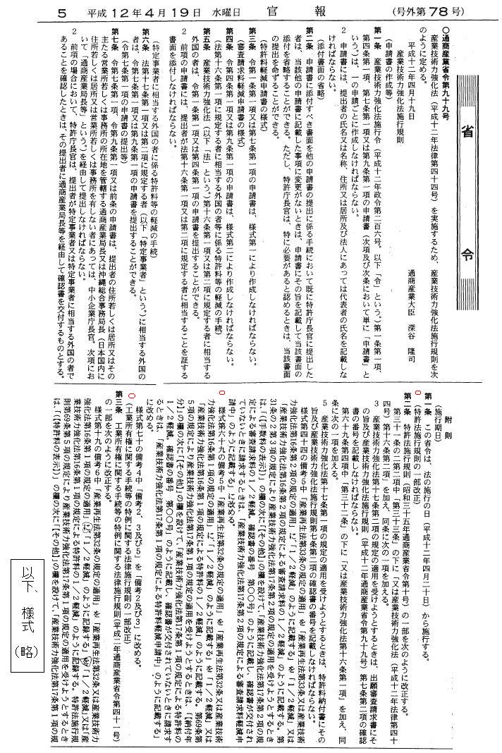 以下、特許法施行規則「様式」、特例法施行規則「様式19」 略。 産業技術力強化法施行規則「様式1」、「様式2」 略。 官報 | |||||||||||||