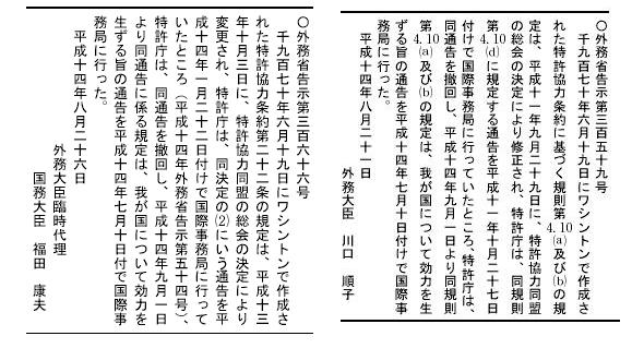 千九百七十年六月十九目にワシントンで作成された特許協力条約(昭和53年7月15日条約第13号 発効:昭和53年10月1日、平成14年3月26日外務省告示第54号変更 発効:平成14年4月1日、平成14年8月26日外務省告示第366号 第22条発効:平成14年9月1日) 日本語pdf(2002.04.01発効) 英語版、英語版PDF、 (改正履歴) |