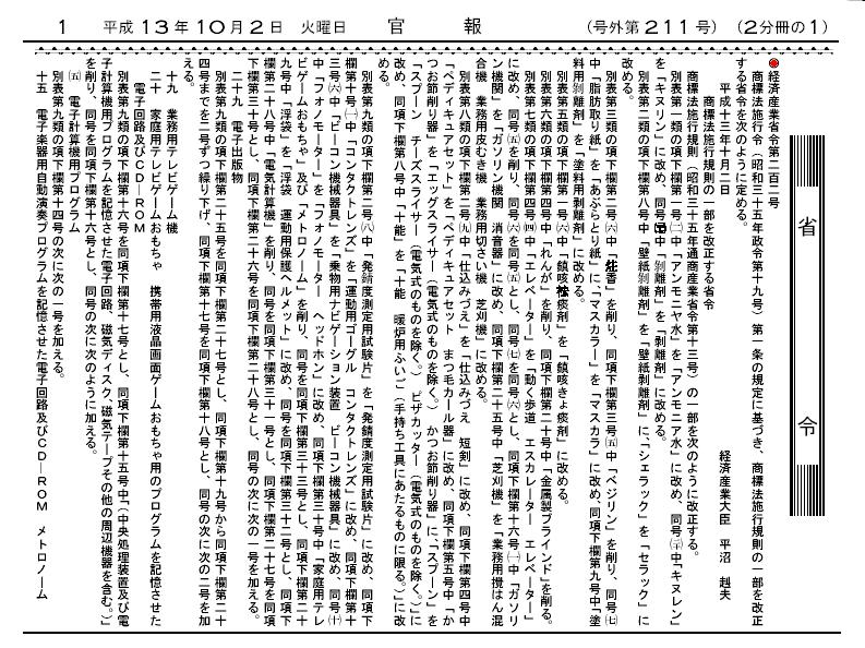 ・平成12年2月7日省令第10号(商標法施行規則及び商標登録令施行規則の一部を改正する省令)第1条 施行:マドリッド協定議定書発効の日(平成12年3月14日) 官報、 官報2、 官報3、 官報4 ・平成12年3月31日省令第92号(特許法施行規則等の一部を改正する省令)第4条 施行:平成12年4月1日改正内容 官報 ・平成12年11月20日省令第357号(弁理士試験規則規則等の一部を改正する省令) 第5条 施行:平成13年1月6日 官報1、 官報2、 官報3、 官報4 ・平成13年10月2日省令第202号(商標施行規則の一部を改正する省令) 施行:平成14年1月1日 別表改正 官報1、 官報2、 官報3、 官報4 官報5 ・平成14年7月19日省令第91号(商標施行規則の一部を改正する政令、注:様式の改正) 施行:平成14年7月19日 改正概要 官報 ・平成14年11月13日省令第113号(商標施行規則の一部を改正する省令) 施行:平成15年1月1日 官報 ・平成15年6月6日省令第72号(特許法施行規則等の一部を改正する省令)第1条 施行:平成15年7月1日 改正内容 官報a、 官報b ・平成15年9月10日省令第101号(工業所有権に関する手続等の特例に関する法律施行規則等の一部を改正する省令)第4条 施行:平成15年10月1日 改正内容官報9 ・平成15年10月27日省令第141号(特許法施行規則等の一部を改正する省令)第4 施行:平成16年1月1日 概要 官報 ・平成15年12月11日省令第153号(特許協力条約に基づく国際出願等に関する法律施行規則の一部を改正する省令) 施行:平成16年1月1日 改正内容 ・平成16年3月2日省令第28号(特許法施行規則等の一部を改正する省令)第4条 施行:平成16年4月1日 改正内容 官報9、官報A、官報B ・平成16年6月4日省令第69号(特許法施行規則等の一部を改正する省令)第4条 施行:平成16年6月4日 改正内容(改正:様式のみ) 官報1、 官報2、 官報3 ・平成17年3月4日省令第14号(不動産登記法等の施行に伴う経済産業省関係省令の整理等に関する省令の一部を改正する省令)第7条(様式) 施行:平成17年3月7日 官報 ・平成17年3月29日省令第30号(特許審査の迅速化等のための特許法等の一部を改正する法律の施行に伴う関係省令の整備等に関する省令)第4条 施行:平成17年4月1日 改正内容 官報1、 官報3、 官報6 ・平成17年10月3日省令96号(工業所有権に関する手続等の特例に関する法律施行規則等の一部を改正する省令)第5条(様式のみ) 施行:平成17年10月3日 官報1、官報2、官報3、官報4 ・平成17年12月12日省令第118号(特許法施行規則等の一部を改正する省令)第4条(様式のみ) 施行:平成17年12月12日 概要、新旧対照表、官報1、官報2 ・平成18年2月15日省令第7号(商法施行規則等の一部を改正する省令)第1条(様式改正あり) 施行:平成18年4月1日官報1、官報2、官報3、官報4 ・平成18年10月27日省令第95号(商法施行規則の一部を改正する省令)(別表のみの改正) 施行:平成19年1月1日、平成19年4月1日 改正内容 官報1、官報2(第35類小売・卸売便益の提供 追加、他) ・平成19年3月26日省令第14号(意匠法等の一部を改正する法律の施行に伴う関係省令の整備及び経過措置等に関する省令)第4条(様式のみ) 施行:平成19年4月1日 改正内容 官報1、官報3、官報5、官報6、官報7、官報8、官報9、官報10 ・平成19年9月28日省令第68号(信託法及び信託法の施行に伴う関係法律の整備等に関する法律の施行に伴う経済産業省関係省令の整備等に関する省令) 第4条 施行:平成19年9月30日 官報1、官報2、官報3、官報4 ・平成20年9月30日省令第69号(特許法等の一部改正に伴う関係省令の整備に関する省令)第4条(様式のみ) 施行:平成20年10月1日 官報3 ・平成21年1月30日省令第5号(特許法施行規則等の一部を改正する省令) 施行:平成21年4月1日 第4条 改正内容 官報1、 官報2、 官報8 ・平成21年6月26日省令第37号(割賦販売法施行規則の一部を改正する省令) 施行:平成21年12月1日、施行日 官報、官報2、官報3 ・平成23年12月5日省令第66号(商標法施行規則の一部を改正する省令) 施行:平成24年1月1日 改正内容 官報1、 官報2、 官報3、 官報4、 官報5 ・平成23年12月28日省令第72号(特許法等の一部を改正する法律の施行に伴う関係省令の整備等に関する省令) 第4条 施行:平成24年4月1日 改正内容 官報1、 官報8、 官報9、 官報a、 官報e ・平成24年12月3日省令第87号(商標法施行規則の一部を改正する省令)(別表のみ) 施行日:平成25年1月1日 改正内容 官報 ・平成24年12月2日省令第58号(商標法施行規則の一部を改正する省令)(別表のみ) 施行日:平成26年1月1日 改正内容 官報 ・平成26年12月12日省令第63号(商標法施行規則の一部を改正する省令)別表のみ 施行:平成27年1月1日 官報1、官報2 概要:商標の国際分類の改訂 ・平成26年12月26日省令第68号(商標法施行規則の一部を改正する省令) 施行:平成27年1月1日 官報 概要:国際事務局に対して納付期限(商標登録をすべき査定又は審決の謄本の送達があった日から三月)までに個別手数料を納付できなかった場合においても、納付期間満了日二月以内に納付期間延長の請求が行われ、特定の手数料が支払われた場合には、納付期間を最大五月まで延長が可能(共通規則第28規則、第5規則)。 ・平成27年2月20日省令第6号(特許