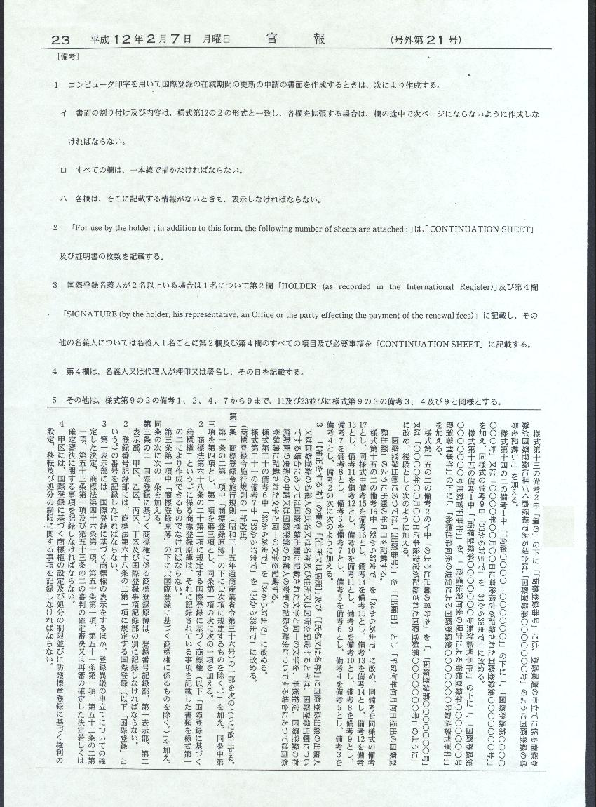 対象省令 ・平成12年2月7日省令第10号(商標法施行規則及び商標登録令施行規則の一部を改正する省令)第2条 施行:マドリッド協定議定書発効の日(平成12年3月14日))  官報1官報2官報3官報4
