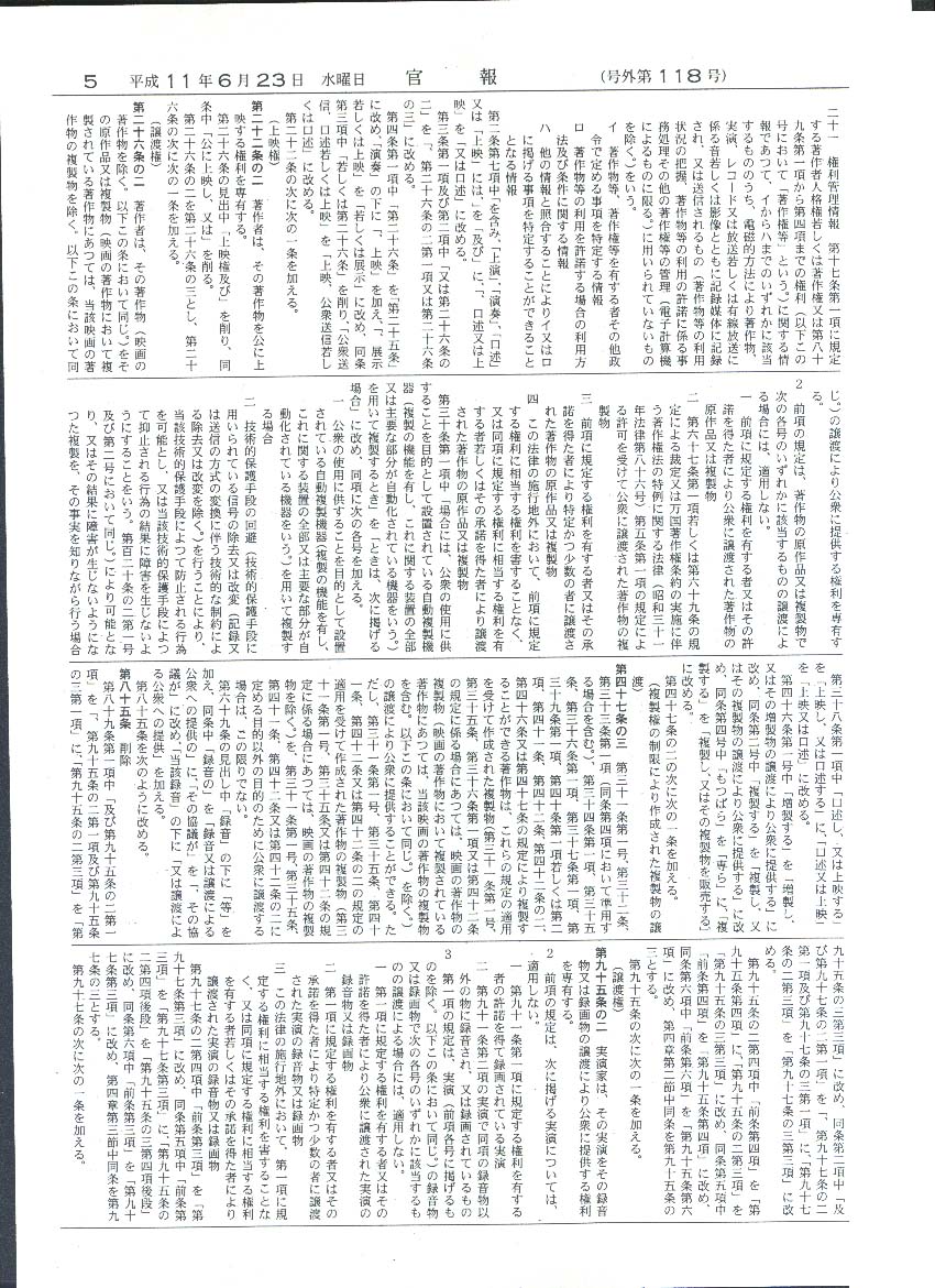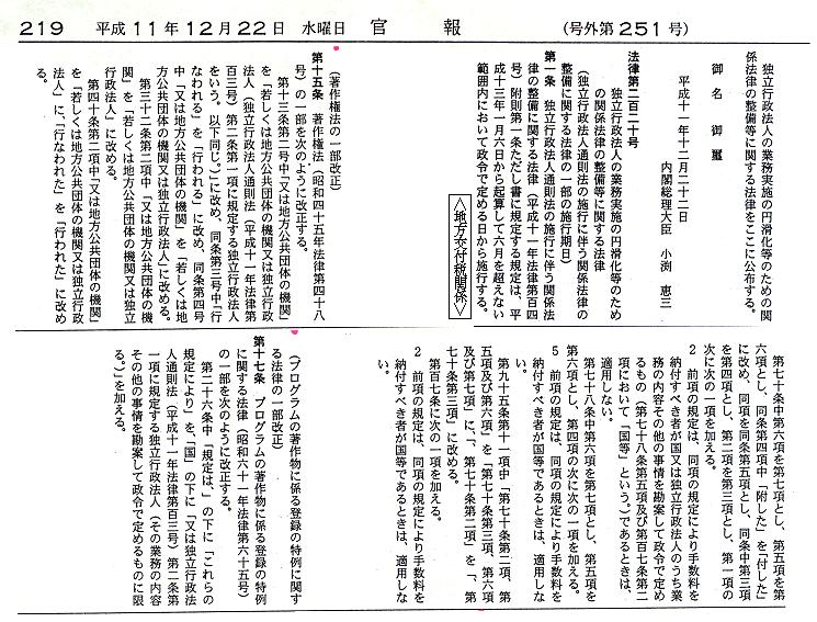 ・平成11年6月23日法律第77号(著作権法の一部を改正する法律) 施行:平成12年1月1日 官報1 官報2 官報3 ・平成十一年十二月二十二日法律第百六十号(中央省庁等改革関係法施行令)第五百六十三条 施行:平成十三年一月六日 官報 ・平成十一年十二月二十二日法律第二百二十号(独立行政法人の業務実施の円滑化のための関係法律の整備等に関する法律)第十五条 施行:平成十三年一月六日 官報1 ・平成12年5月8日法律第56号(著作権法及び万国著作権条約の実施に伴う著作権法の特例に関する法律の一部を改正する法律)第1条 施行:平成13年1月1日。但し、第58条については、著作権に関する世界知的所有権機関条約が日本国について効力を発効する日。 (注)第58条:日本加盟平成12年5月8日、21カ国目。30カ国加盟により発効。(H13.02.09時点) 官報 ・平成12年11月29日法律第131号(著作権等管理事業法)附則第8条 施行:平成13年10月1日 官報 |