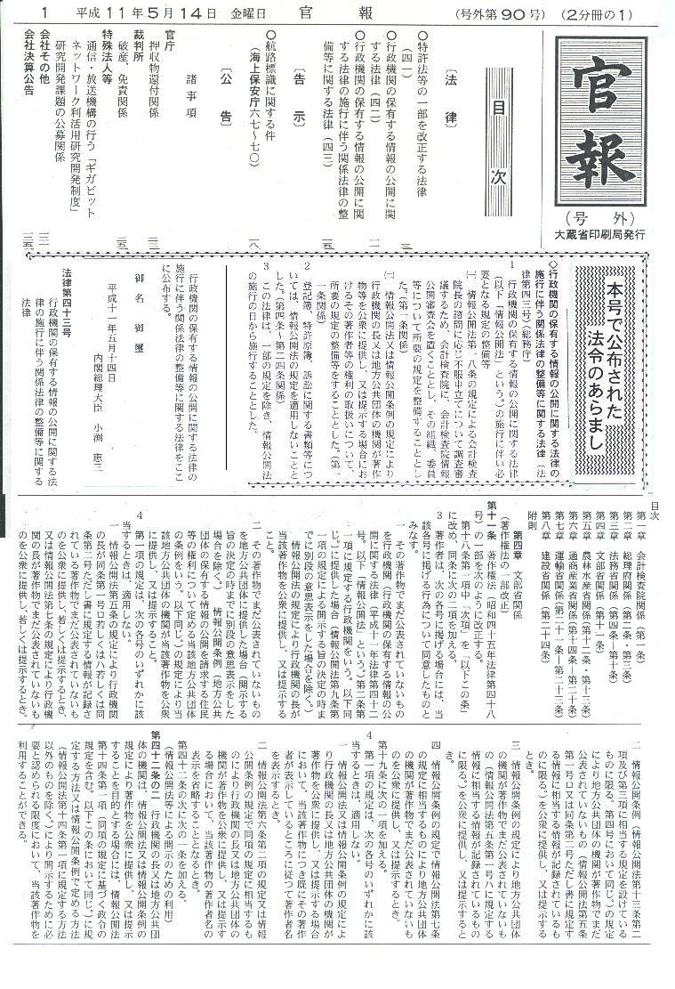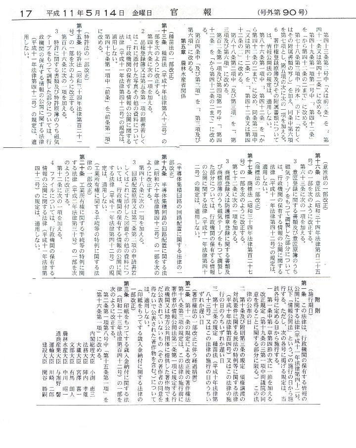 ・平成11年5月14日法律第43号(行政機関の保有する情報の公開に関する法律の施行に伴う関係法律の整備等に関する法律)第11条 施行:政令で定める日(平成13年4月1日)