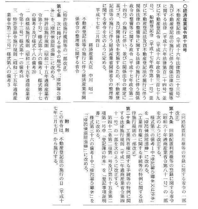 ・平成11年9月30日共省令第1号(産業活力再生特別措置法施行規則) (注):総理府、厚生省、農林水産庁、通商産業省、運輸省、郵政省、建設省・共省令附則第2条 施行:平成11年10月1日 官報 ・平成11年12月28日省令第132号(特許法施行規則等の一部を改正する省令)第1条 施行:平成12年1月1日改正内容 官報1他、【全改正条令】参照。 ・平成12年3月31日省令第92号(特許法施行規則等の一部を改正する省令)第1条 施行:平成12年4月1日改正内容 官報 ・平成12年4月19日省令第99号(産業技術力強化法施行規則:新設)附則2条 施行:平成12年4月20日官報 ・平成12年11月20日省令第357号(弁理士試験規則規則等の一部を改正する省令) 第2条 施行:平成13年1月6日 官報1、 官報2、 官報3、 官報4 ・平成13年2月13日省令第7号(工業所有権の手続等の特例に関する法律施行規則等の一部を改正する省令) 施行:交付の日:平成13年2月13日官報 ・平成13年5月31日省令第166号(工業所有権に関する手続等の特例に関する法律施行規則等の一部を改正する省令)第1条 施行:平成13年6月1日官報 ・平成13年9月6日省令第190号(特許法施行規則の一部を改正する省令) 施行:平成13年10月1日官報 ・平成13年11月20日省令第207号(特許法施行規則の一部を改正する省令) 施行:平成13年12月1日官報 ・平成14年8月1日省令第94号(特許法施行規則等の一部を改正する政令)第1条 施行:平成14年9月1日改正概要、官報 ・平成15年6月6日省令第72号(特許法施行規則等の一部を改正する省令)第1条 施行:平成15年7月1日 改正内容 官報 ・平成15年9月4日省令第99号(特許法施行規則及び実用新案法施行規則の一部を改正する省令)第1条 施行:平成16年1月1日官報 ・平成15年9月10日省令第101号(工業所有権に関する手続等の特例に関する法律施行規則等の一部を改正する省令)第2条 施行:平成15年10月1日 改正内容 ・平成15年10月27日省令第141号(特許法施行規則等の一部を改正する省令)第1条 施行:平成16年1月1日 概要 官報1、官報2、官報3、官報4 ・平成16年3月2日省令第28号(特許法施行規則等の一部を改正する省令)第1条 施行:平成16年4月1日 改正内容 官報1、官報2、官報3、官報4、官報5 ・平成16年6月4日省令第69号(特許法施行規則等の一部を改正する省令)第1条 施行:平成16年6月4日 改正内容(改正:様式のみ) 官報1、 官報2、 官報3 ・平成17年3月4日省令第14号(不動産登記法等の施行に伴う経済産業省関係省令の整理等に関する省令の一部を改正する省令)第7条(様式) 施行:平成17年3月7日 官報 ・平成17年3月29日省令第30号(特許審査の迅速化等のための特許法等の一部を改正する法律の施行に伴う関係省令の整備等に関する省令)第1条 施行:平成17年4月1日 改正内容 官報1、 官報2 | ||||||