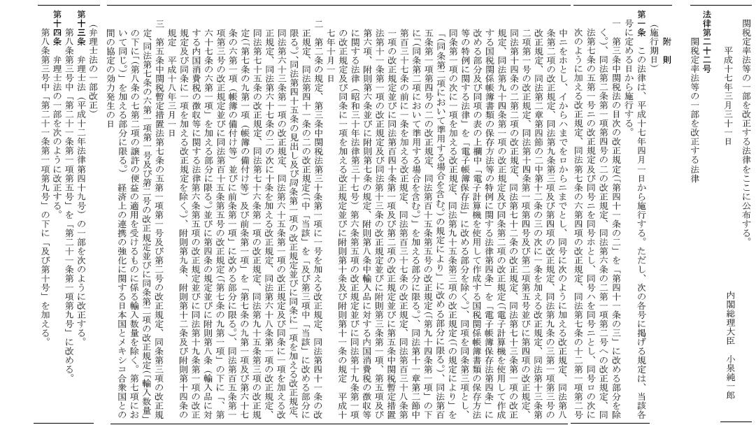 | 平成17年3月31日 | 法律 第22号 | 関税定率法等の一部を改正する法律 | 施行:平成17年4月1日 | 附13.14条-弁 | 官報 |