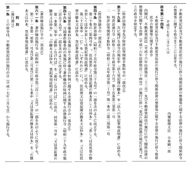 | 平成17年2月18日 | 政令 第24号 | 不動産登記法及び不動産登記法の施行に伴う関係法律の整備等に関する法律の施行に伴う関係政令の整備等に関する政令の一部を改正する政令 | 施行:平成17年3月7日 | 39条-特施令・特手料、40条-特登令、46条-著特施令、61条-著施令 | 官報 |
