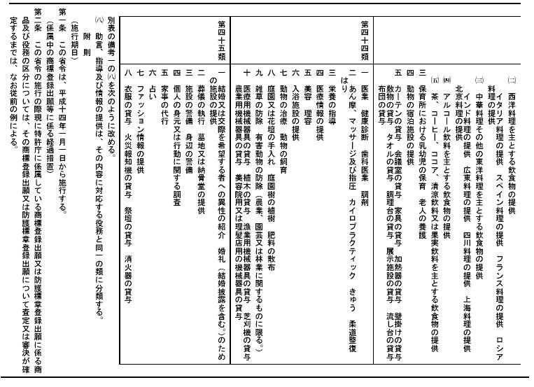 第1,2,3,5,6,7,8,9,10,11,15,16,19,20,21,24,28,30,31,33,35,37,38,39,40,41,42類 改正。 第43,44,45類 追加(第42類を4分割)。 改正内容 |