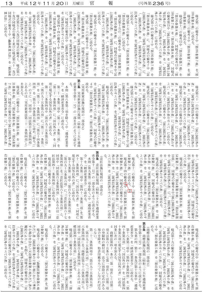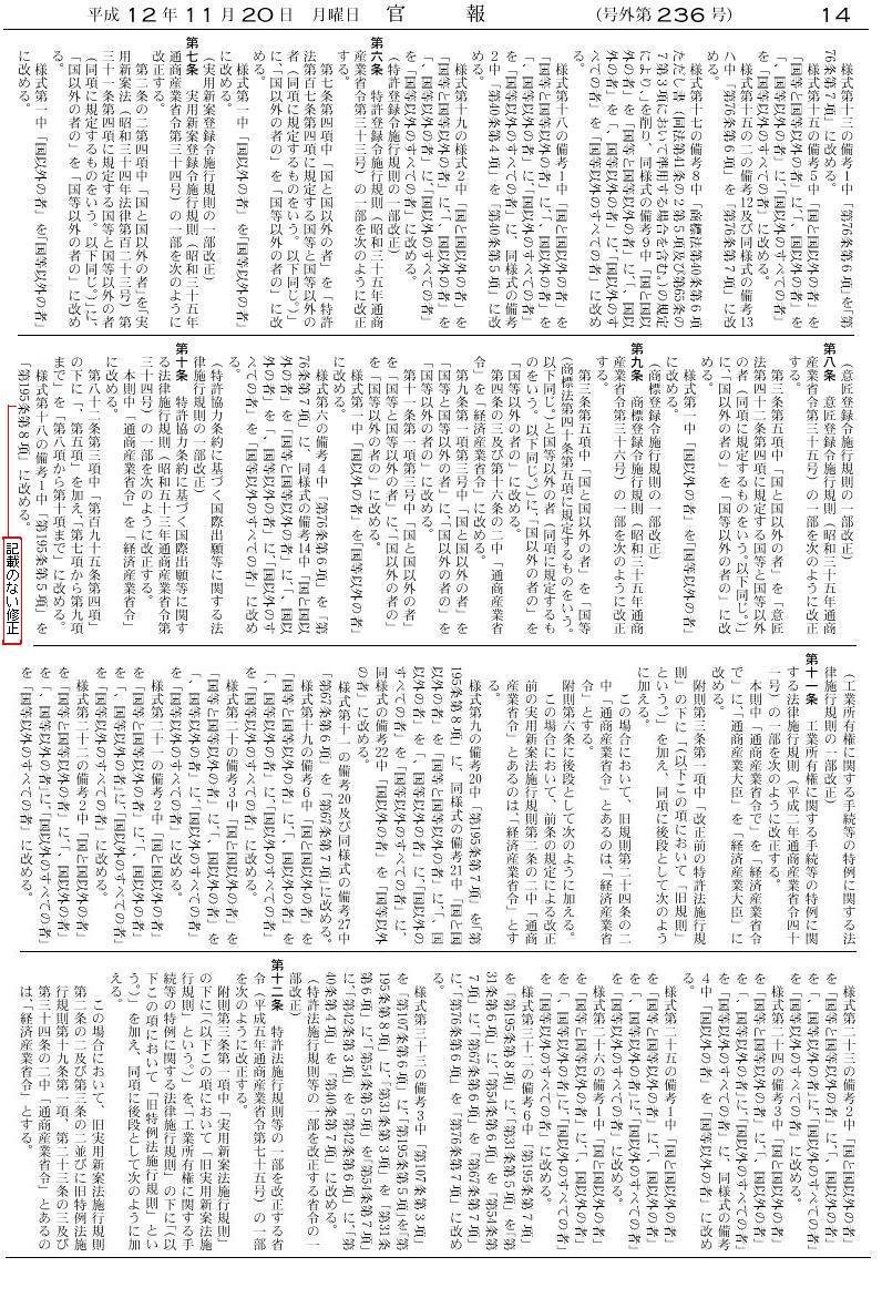 ・平成11年12月28日省令第132号(特許法施行規則等の一部を改正する省令)第2条 施行:平成12年1月1日改正内容