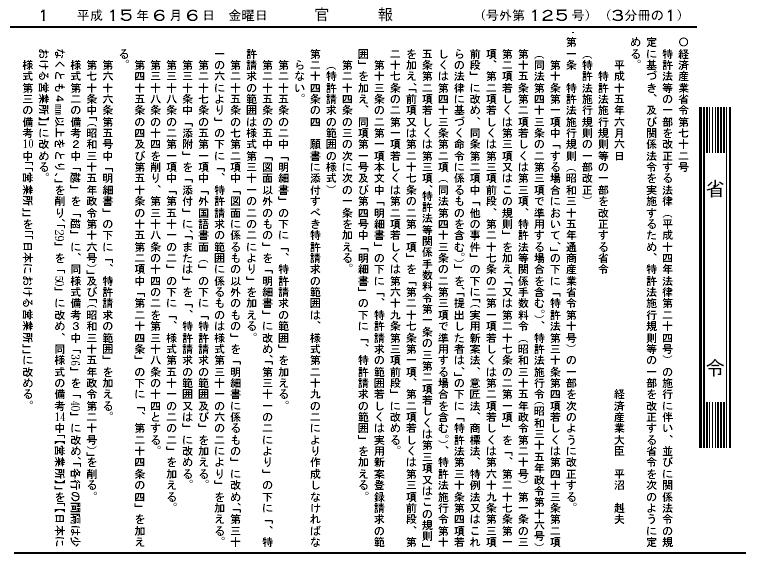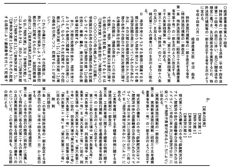 ・平成12年3月31日省令第92号(特許法施行規則等の一部を改正する省令)第2条 施行:平成12年4月1日改正内容 官報 ・平成12年11月20日省令第357号(弁理士試験規則規則等の一部を改正する省令) 第3条 施行:平成13年1月6日 官報1、 官報2、 官報3、 官報4 ・平成14年8月1日省令第94号(特許法施行規則等の一部を改正する政令、注:改正は様式のみ)第2条 施行:平成14年9月1日改正概要、官報 ・平成15年6月6日省令第72号(特許法施行規則等の一部を改正する省令)第2条 施行:平成15年7月1日 改正内容 官報 ・平成15年9月4日省令第99号(特許法施行規則及び実用新案法施行規則の一部を改正する省令)第2条 施行:平成16年1月1日官報 ・平成15年10月27日省令第141号(特許法施行規則等の一部を改正する省令)第2条 施行:平成16年1月1日 概要 官報 ・平成15年12月11日省令第153号(特許協力条約に基づく国際出願等に関する法律施行規則の一部を改正する省令)第2条 施行:平成16年1月1日 改正内容 ・平成16年3月2日省令第28号(特許法施行規則等の一部を改正する省令)第2条 施行:平成16年4月1日 改正内容 官報5、官報6、官報7 ・平成16年6月4日省令第69号(特許法施行規則等の一部を改正する省令)第2条 施行:平成16年6月4日 改正内容(改正:様式のみ) 官報1、 官報2、 官報3 ・平成17年3月29日省令第30号(特許審査の迅速化等のための特許法等の一部を改正する法律の施行に伴う関係省令の整備等に関する省令)第2条 施行:平成17年4月1日 改正内容 官報1、 官報2、 官報3 ・平成17年10月3日省令96号(工業所有権に関する手続等の特例に関する法律施行規則等の一部を改正する省令)第3条(様式のみ) 施行:平成17年10月3日 官報1、官報2、官報3、官報4 ・平成17年12月12日省令第118号(特許法施行規則等の一部を改正する省令)第2条(様式のみ) 施行:平成17年12月12日 概要、新旧対照表、官報1、官報2 ・平成19年3月26日省令第14号(意匠法等の一部を改正する法律の施行に伴う関係省令の整備及び経過措置等に関する省令)第2条(様式のみ) 施行:平成19年4月1日 改正内容 官報1、官報2、官報5 ・平成19年3月30日省令第26号(特許協力条約に基づく国際出願等に関する法律施行規則等の一部を改正する省令)第3条 施行:平成19年4月1日 官報1、官報11 ・平成19年8月3日省令第50号(産業活力再生特別措置法等の一部を改正する法律の施行に伴う経済産業省関係省令の整備に関する省令)第4条 施行:平成19年8月6日 官報1、官報2、官報3 | ||||